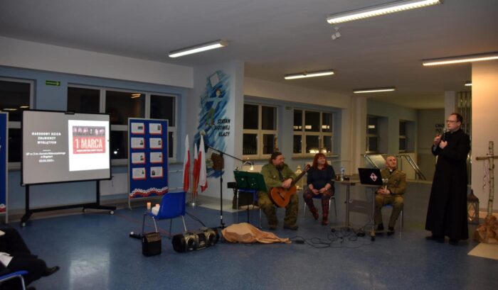 ks. dr Łukasza Świerniaka – diecezjalnego kapelana Związku Strzeleckiego. Przedstawiając uczniom trudną drogę Polski do niepodległości katecheta pokazał skąd pochodzili i kim w rzeczywistości byli Żołnierze Niezłomni. Przepiękna opowieść uwzględniająca losy Polski od Powstania Styczniowego aż po współczesne czasy wzruszyła i zafascynowała wszystkich. Uczniowie z zapartym tchem słuchali o wyboistej drodze prowadzącej nasz kraj do wolności w kluczu hasła „Bóg-Honor-Ojczyzna”. Wystąpienie uatrakcyjniły filmy uzyskane przez księdza Łukasza z zasobów Instytutu Pamięci Narodowej.